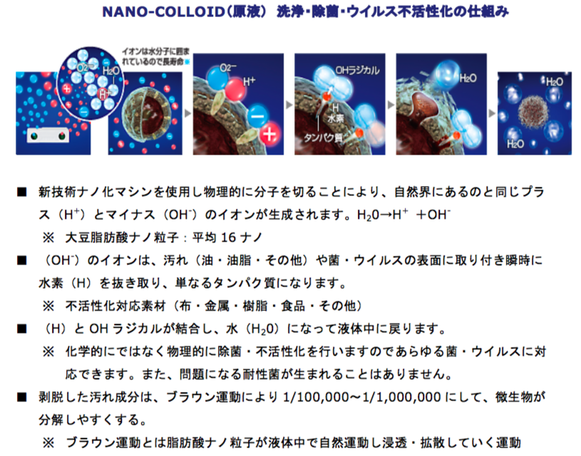 原料は、食品として使用されている大豆脂肪酸と水(精製水)。 それらをナノ粒子にし活性化させ、汚れを剥がして分解するという全く新しい洗浄方式の洗浄剤です。 表面に付着した物理的な汚れは、コロイド洗浄(ブラウン運動)によりイオン結合を破壊して剥離します。 酸化油脂などの化学的な汚れは、分解洗浄後に鹸化します。そのため泡立ちが少なく 水の使用量を従来の1/3に抑えることができます。 また、ナノ粒子が表面にコーティング効果を与え、汚れの再付着を抑制します。